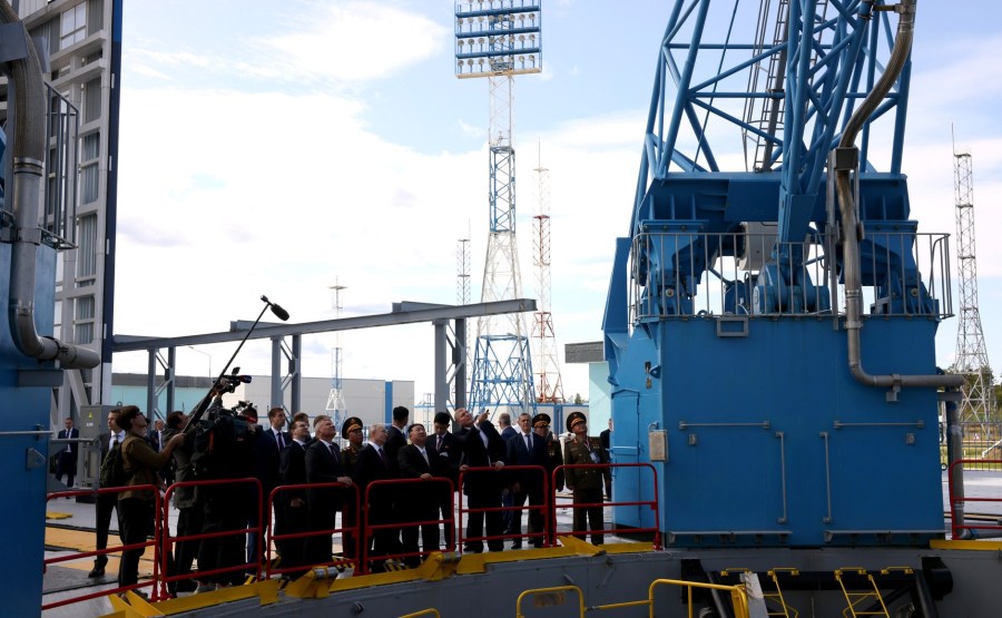Les dirigeants ont inspecté les installations du nouveau cosmodrome, notamment une salle d’assemblage des propulseurs pour les lanceurs Angara, le site de lancement du lanceur spatial Soyouz-2, un site de lancement Angara en construction et le centre de contrôle de lancement.
