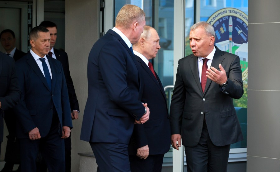 4 sur 19 Avant une visite conjointe au cosmodrome de Vostochny avec le président des Affaires d’État de la République populaire démocratique de Corée, Kim Jong-un. Avec le vice-Premier ministre et envoyé plénipotentiaire du Président dans le District fédéral d’Extrême-Orient Yury Trutnev (première à gauche), le directeur général du Centre pour l’exploitation des infrastructures spatiales au sol Nikolai Nestechuk (au centre) et le directeur général de Roscosmos Yury Borisov (à droite). Photo : Vladimir Smirnov, TASS