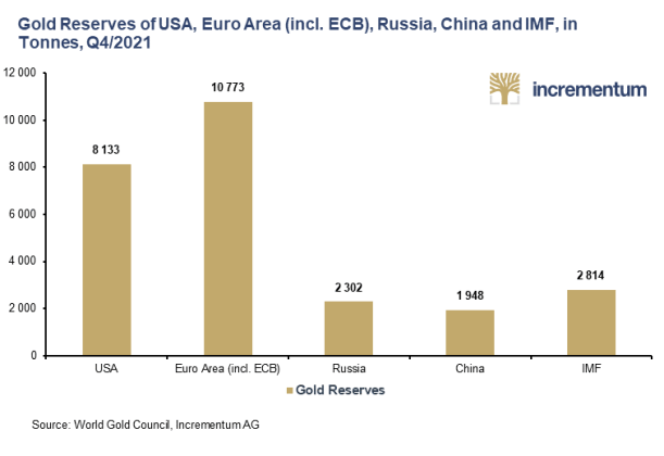 Réserves d’or déclarées des États-Unis, la zone euro (BCE incluse), la Russie, la Chine et le FMI (T4 2021)