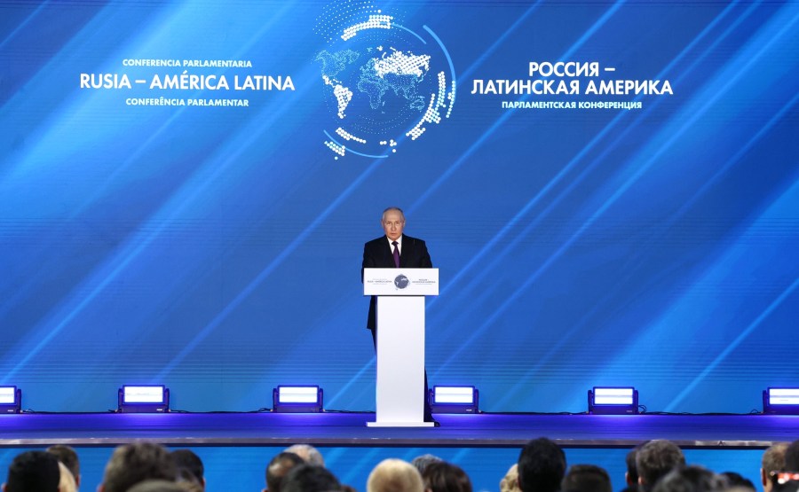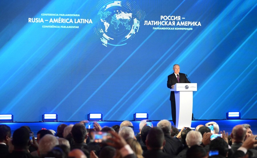 7 sur 7 – Vladimir Poutine a pris la parole à l’ouverture de la Conférence parlementaire internationale Russie-Amérique latine. Photo : Mikhaïl Metzel, TASS