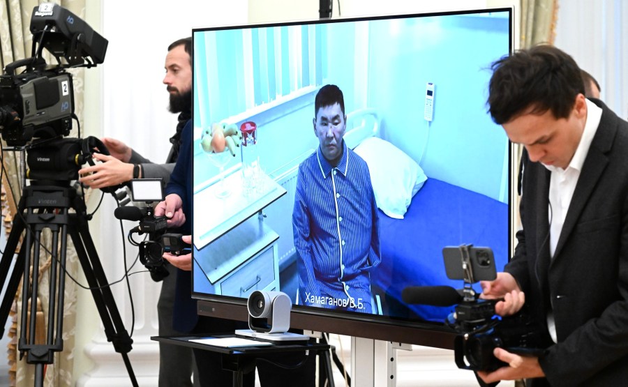 4 sur 6 – Rencontre avec les participants à l’opération militaire spéciale. Le sergent principal Viktor Khamaganov a reçu l’Ordre du Courage et a participé à la réunion par vidéoconférence depuis l’hôpital. Photo : Pavel Bedniakov, RIA Novosti