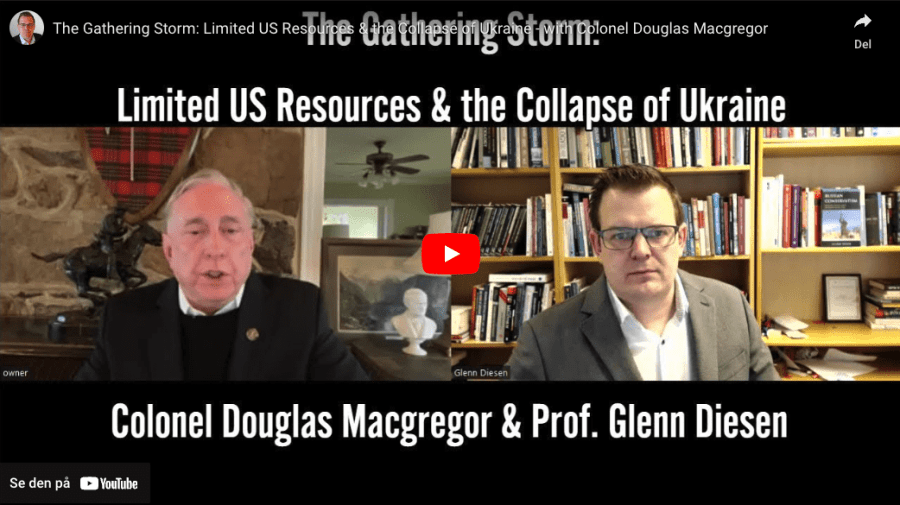Le 15 septembre dernier, un entretien de 42minutes entre le politologue norvégien Glenn Diesen et l’ancien colonel de l’armée américaine Douglas Macgregor a été mis en ligne sous forme de vidéo3 et, quelques jours plus tard, le 21 septembre, en format texte traduit en allemand par seniora.org4, ce dont nous le remercions. Il faut absolument lire ce texte détaillé.