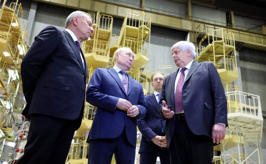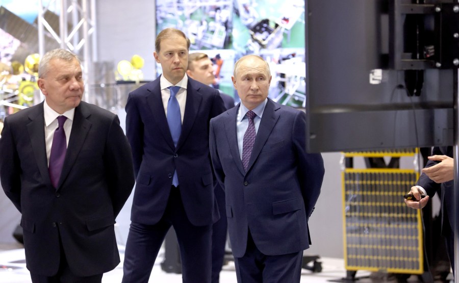 Visite de l’Energia Rocket and Space Corporation. Avec le vice-Premier ministre et ministre de l’Industrie et du Commerce Denis Manturov, le directeur général de Roscosmos Yury Borisov et le concepteur en chef d’Energia Vladimir Solovyov (à gauche). Photo : Grigori Sisoev, RIA Novosti