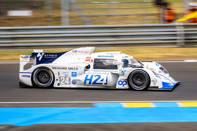 Vue latérale du prototype de voiture de course à hydrogène électrique MissionH24 roulant sur le circuit des 24 heures du Mans lors d’une séance d’essais.
