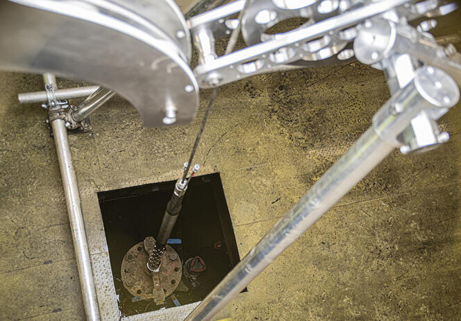 Détail vu du haut de la sonde de mesure SysMoG™ positionnée avant la descente dans le forage. Le dispositif de monitoring a été miniaturisé de telle façon qu’il puisse être introduit dans un puits de 6 cm de diamètre.