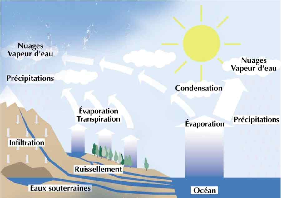 L’eau douce se renouvelle en permanence par le cycle de l’eau. Elle passe de la mer à l’atmosphère, puis de la terre à la mer, en suivant un cycle qui se répète indéfiniment suivant plusieurs étapes :