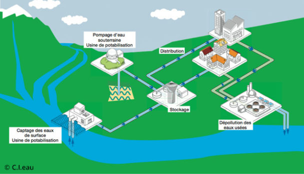 L’eau est ensuite rejetée à la nature, avant de recommencer son cycle domestique : puisage, traitement, distribution par le réseau d’eau, dépollution, puis retour de l’eau dans la nature.