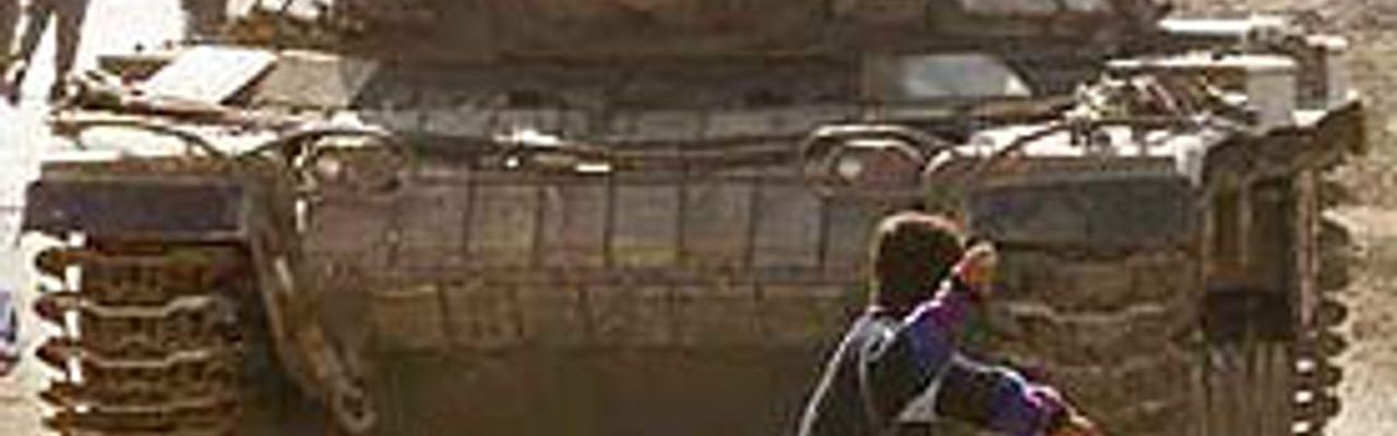PH 05 Faris Odeh, un garçon de 14 ans qui a été tué début novembre 2000, pendant la deuxième Intifada, jette une pierre sur un char des Forces de défense israéliennes dans la bande de Gaza. Cette photo a été prise le 29 octobre 2000 et Odeh a été abattu dix jours plus tard, le 8 novembre, alors qu’il jetait à nouveau des pierres sur les troupes israéliennes. [Photo: Associated Press/Laurent Rebours)]