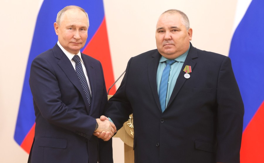 4 Cérémonie de remise des décorations d’État. La Médaille du courage, 2e classe, décernée à Viatcheslav Dzyuba, membre de la commission électorale du district au bureau de vote n° 948 à Vladimirovka, district de Volnovakha, République populaire de Donetsk. Photo : Mikhaïl Metzel, TASS