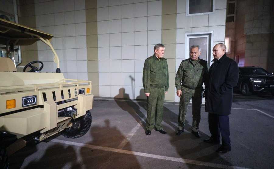 6 Au quartier général de la Région militaire Sud. De gauche à droite : le ministre de la Défense Sergueï Choïgu, le chef d’état-major des forces armées russes Valéri Gerasimov et le chef de la direction opérationnelle principale de l’état-major général des forces armées russes Sergueï Rudskoy.