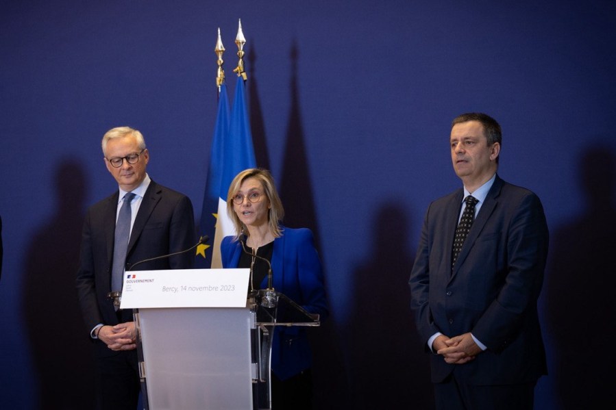 Le 14 novembre, EDF et le gouvernement ont présenté leur accord sur le prix de référence de l’électricité nucléaire. De gauche à droite : Bruno Le Maire, ministre de l’Économie ; Agnès Pannier-Runacher, ministre de la Transition énergétique ; Luc Rémont, PDG d’EDF. ©MTE