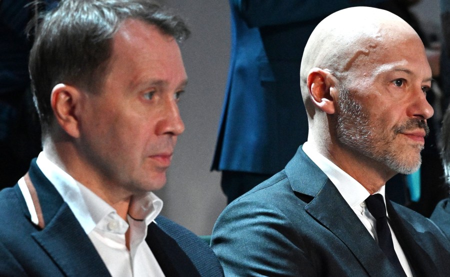 16 Le directeur artistique du Théâtre des Nations Eugène Mironov, à gauche, et le réalisateur Fiodor Bondarchuk lors de la séance plénière du Forum des cultures unies. Photo : Pavel Bedniakov, RIA Novosti