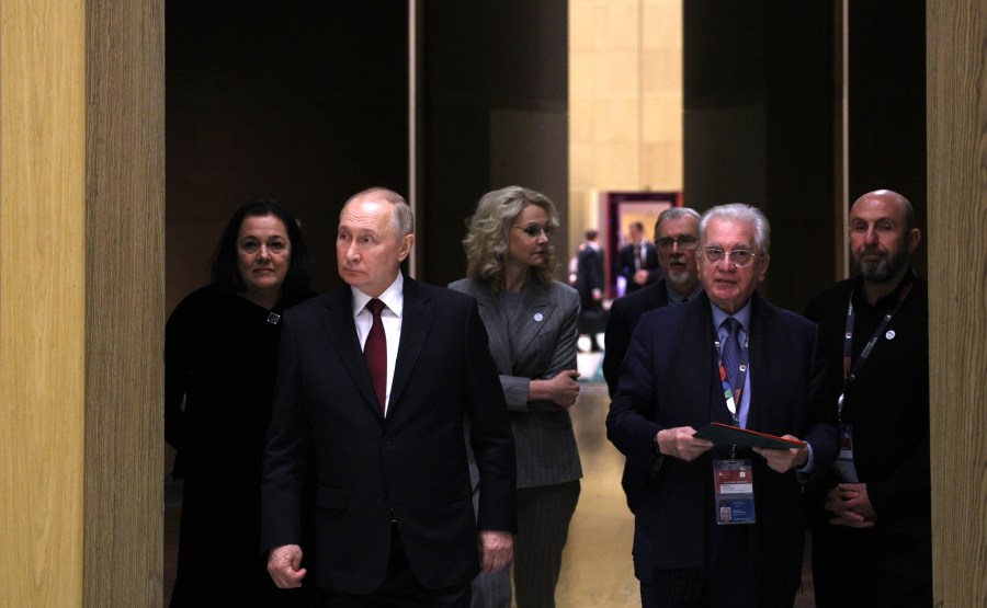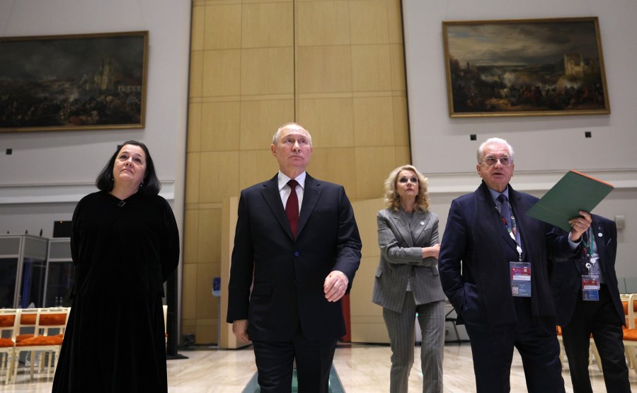 Après la fin de la séance plénière, Vladimir Poutine a visité les salles de l’aile est du bâtiment de l’état-major général, qui fait partie du complexe d’exposition du Musée de l’Ermitage.