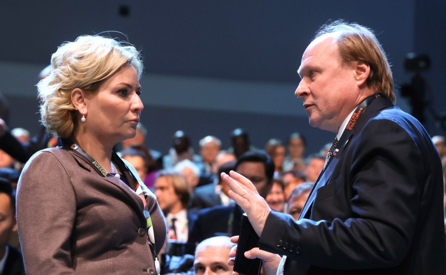4 La ministre de la Culture Olga Lyubimova et le conseiller du président pour les affaires culturelles Vladimir Tolstoï avant la séance plénière du Forum des cultures unies. Photo : Mikhaïl Metzel, TASS
