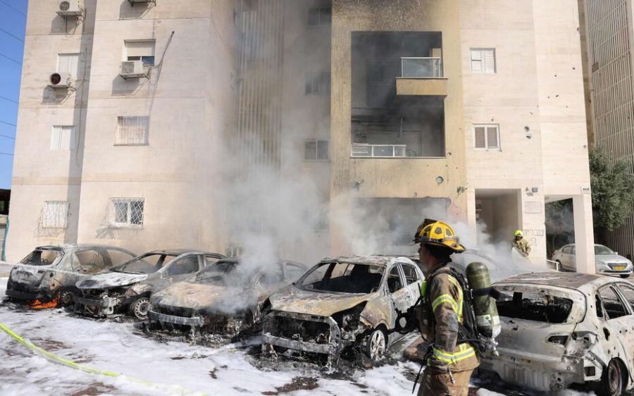 Des équipes de pompiers israéliens éteignent le feu dans un parking à l’extérieur d’un immeuble résidentiel à la suite d’une attaque à la roquette depuis la bande de Gaza dans la ville d’Ashkelon, dans le sud d’Israël, le 7 octobre 2023. AFP/Ahmad Gharabli
