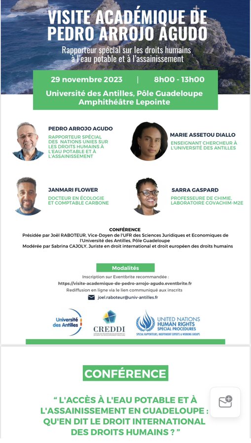 En Guadeloupe, la visite du rapporteur spécial de l’ONU Pedro Arrojo Agudo, sur la question de l’eau a provoqué l’affolement des pouvoirs publics. Alors qu’il devait donner mercredi 29 novembre une conférence, d’abord publique, puis réservée aux universitaires et étudiants, à l’Université des Antilles, elle a été annulée au dernier moment en raison de « pressions ». « Choqué », le rapporteur a tenu à faire une allocution publique dans la rue !