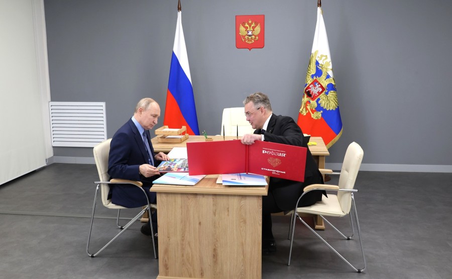 A la fin de son voyage dans le District fédéral du Caucase du Nord, Vladimir Poutine a tenu une réunion de travail avec le gouverneur du territoire de Stavropol, Vladimir Vladimirov.