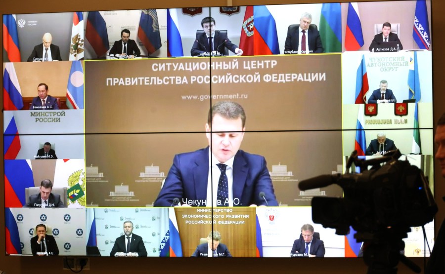 1 Lors d’une réunion par vidéoconférence sur le développement des principales communautés de l’Arctique russe. Avec le gouverneur de la région d’Arkhangelsk, Alexander Tsybulsky (à droite) et l’envoyé plénipotentiaire présidentiel auprès du district fédéral du Nord-Ouest, Alexander Gutsan.