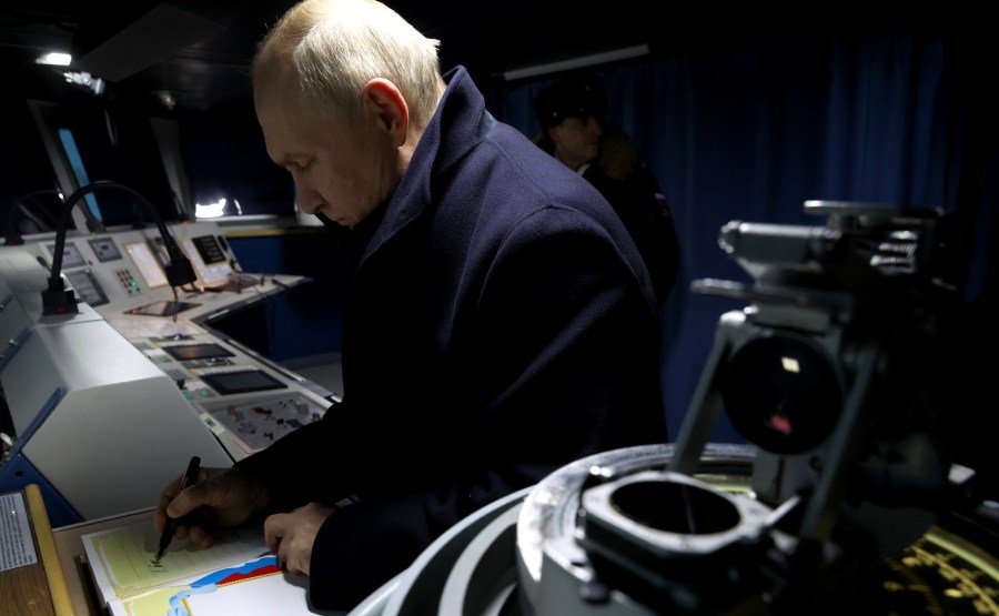 Vladimir Poutine est ensuite monté à bord de la frégate Admiral Kasatonov, où il a inspecté les systèmes d’armes du navire. En souvenir de sa visite, le Président a signé le livre d’or distingué.