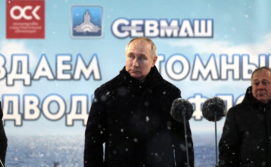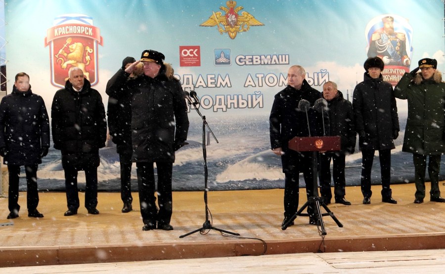 Je voudrais féliciter les forces navales et les constructeurs navals de Sevmash pour l’événement important d’aujourd’hui. J’exprime ma gratitude aux employés de l’entreprise pour leur professionnalisme et leur dévouement. Je souhaite un service réussi aux équipages des sous-marins lance-missiles balistiques dans l’intérêt de notre peuple et de notre pays.