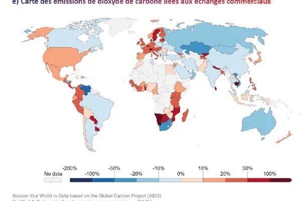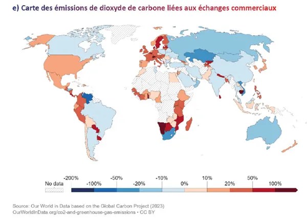 Les pays indiqués en rouge sur cette carte (e) sont des importateurs nets d’émissions : ils importent plus de CO2, par le biais des échanges de biens commerciaux qu’ils n’en exportent. Les pays indiqués en bleu sont quant à eux des exportateurs nets d’émissions, c’est-à-dire qu’ils exportent plus de CO2 par le biais des échanges de biens commerciaux qu’ils n’en importent. Sur cette carte, les États-Unis sont une valeur de 10,21%, ce qui signifie que leur importation nette de CO2 équivaut à 10,21 % de leurs émissions nationales. Ainsi, les émissions liées à la consommation des États-Unis sont 10,21 % plus élevées que les émissions basées sur leur production. Au contraire, la Chine se voit attribuer une valeur de -8,42 %, ce qui signifie que les émissions liée s à sa consommation sont 8,42 % moins élevées que les émissions basées sur sa production.