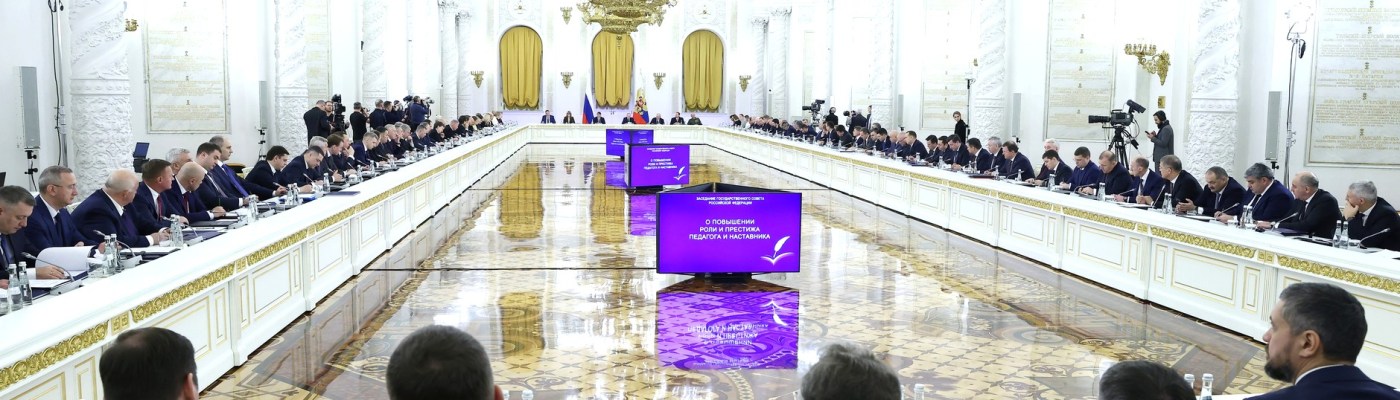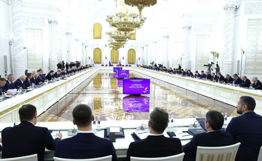 Vladimir Poutine a tenu une réunion du Conseil d’État sur l’augmentation du rôle et du prestige des enseignants et des mentors dans la salle Saint-Georges du Grand Palais du Kremlin.