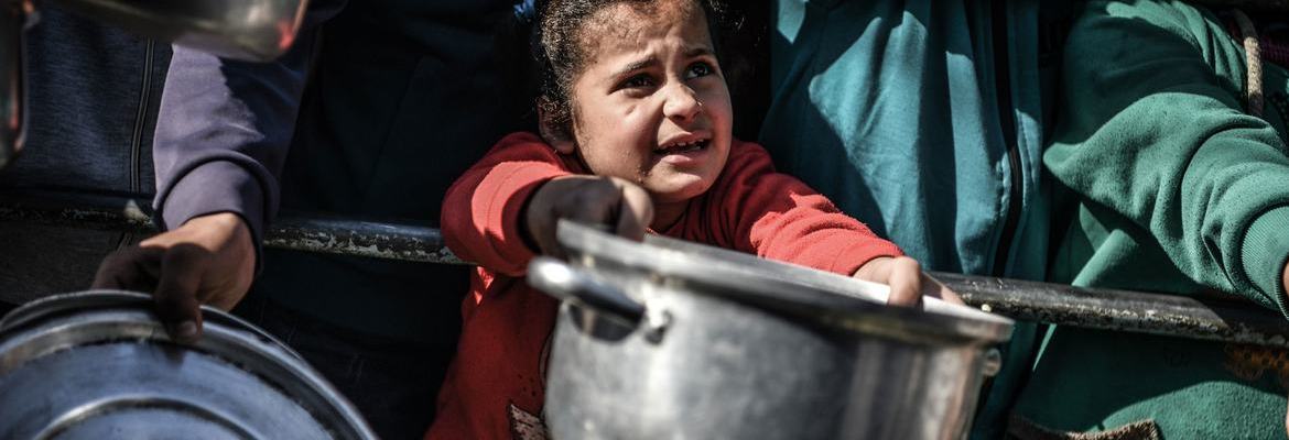 UNICEF -Abed Zagout – Une enfant de huit ans attend son tour pour recevoir de la nourriture à Rafah, dans le sud de la bande de Gaza.