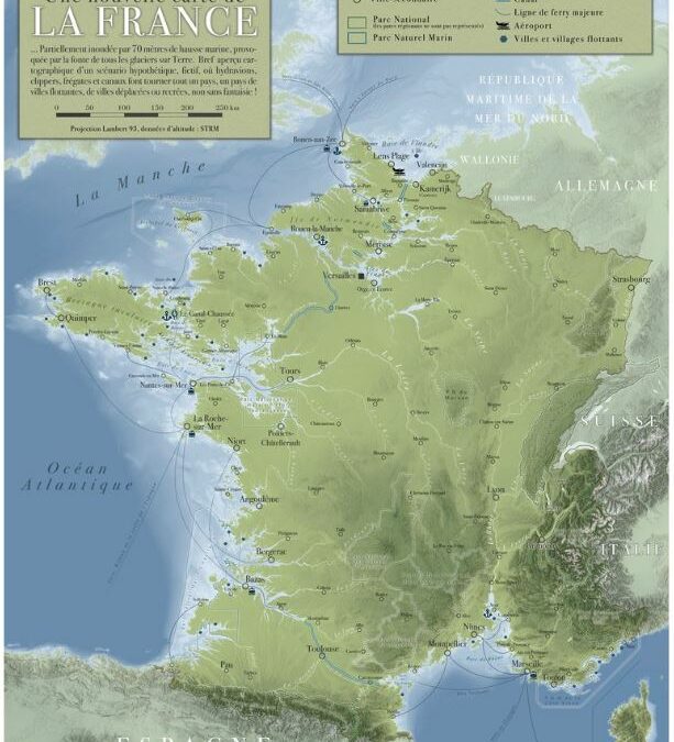 Même si le scénario est très improbable, voire carrément fictif, cette carte imagine propose une France du futur avec un niveau marin à 70 mètres plus haut qu’aujourd’hui : côtes redessinées, villes englouties et relocalisées, nouvelles baies et archipels. Même les avions de passagers ont cédé la place aux hydravions, aux clippers, aux canaux et autres déplacements aquatiques en tout genre.