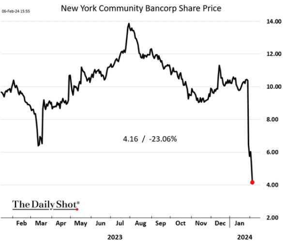 Or, depuis quelques semaines, de nouveaux craquements se font entendre sur le front des petites banques régionales américaines comme en témoigne l’effondrement du cours de bourse de la New York Community Bank, en baisse de 63% en 1 mois ! L’indice des banques régionales quant à lui est en baisse de 13% depuis le début de l’année.