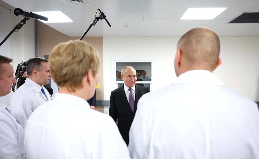 1 Lors d’une visite au Centre régional d’oncologie de Tula. Le Président était accompagné de l’envoyé plénipotentiaire présidentiel auprès du District fédéral central, Igor Shchegolev, et du gouverneur de la région de Toula, Alexei Dyumin. La visite a été dirigée par le médecin-chef par intérim du Centre d’oncologie, Dmitry Istomin. Photo : Alexandre Kazakov, RIA Novosti