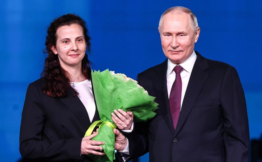 12 Soirée de gala dédiée au 300e anniversaire de l’Académie des sciences de Russie. Vladimir Poutine décerne le Prix présidentiel 2023 pour la science et l’innovation pour les jeunes scientifiques à Olga Yakubovich, professeure agrégée au département de géochimie de l’Université d’État de Saint-Pétersbourg (doctorante en géologie et minéralogie). Photo : Valéry Sharifulin, TASS