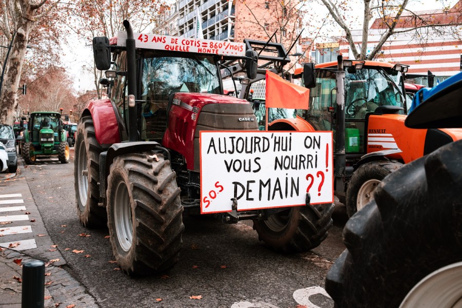 France, Toulouse, 16-01-2023. Pancarte : Aujourd’hui hui on vous nourri, sos demain. A l appel de la FNSEA et des Jeunes Agriculteurs, 400 tracteurs ont envahi Toulouse pour faire entendre leurs revendications. Ils dénoncent l augmentation des couts de production, la hausse des charges, la gestion des maladies telles que la grippe aviaire, des démarches administratives toujours plus pesantes, et des revenus toujours aussi faibles. Photographie de Adrien Nowak / Hans Lucas