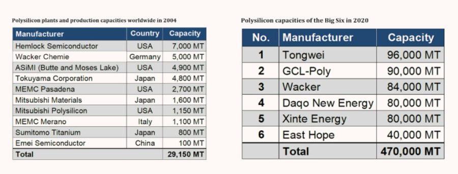 Ce silicium doit être épuré pour atteindre une pureté de 9N (99,9999999) afin d’être transformé en qualité photovoltaïque. Or, alors qu’ils étaient leaders dans les années 2010, l’Europe et les États-Unis sont devenus marginaux dans la production de ce matériau. Seule l’entreprise allemande Wacker a su rester un acteur majeur, grâce à sa qualité, même si la pression exercée sur les prix et les mesures anti-dumping ont été structurantes pour donner aujourd’hui une part de marché de plus de 90% aux producteurs chinois. Les deux tableaux suivants l’illustrent* :
