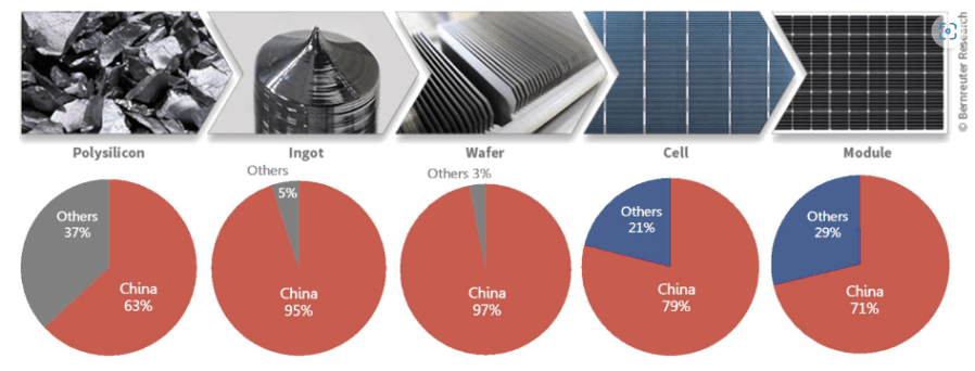 En 2022, 827.000* tonnes de silicium PV ont été fabriquées en Chine contre environ 40.000 tonnes en Allemagne. Compte tenu des rendements de transformation, il faut environ 6 tonnes de ressources naturelles rares pour produire une tonne de silicium photovoltaïque ou « polysilicium » (5.8T/T pour produire le Mg-Si, puis 5% minimum de pertes à la transformation Mg-Si en PV-Si).