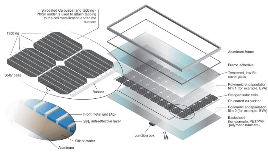 Enfin, l’assemblage de cellules, interconnectées par des collecteurs à base de cuivre, est encapsulé entre deux feuilles d’EVA afin de résister environ 20 ans aux conditions atmosphériques, puis collé sous une feuille de verre, muni d’un cadre en aluminium, pour devenir un module. La tendance lourde est à la multiplication des formats de cellules, entières ou demi-cellules, afin d’optimiser rendement et capacité par module. Des 150 WattC des années 2010, nous passons à des modules délivrant maintenant 500 WattC1. La Chine a produit l’équivalent de 288 GW de modules en 2022.