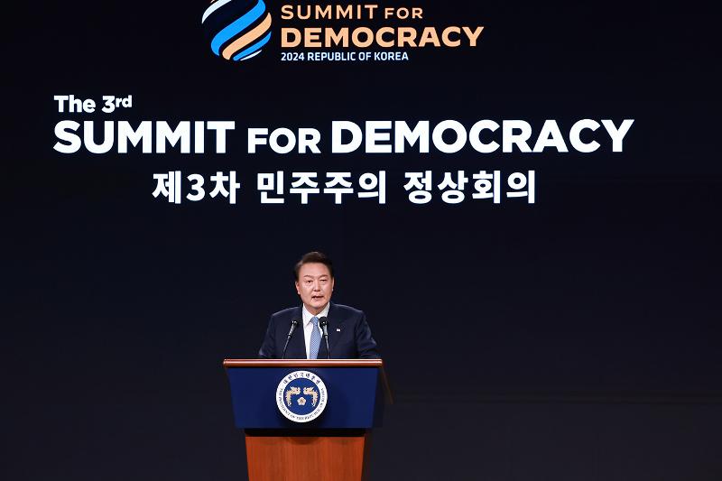 Le président Yoon Suk Yeol prononce son discours de bienvenue lors de la conférence ministérielle du troisième sommet pour la démocratie, à Séoul, le 18 mars 2024. © Agence de presse Yonhap