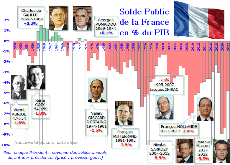 Simultanément la fiscalité portant sur une production et des revenus qui ne cessent de se développer peut nourrir l’affermissement d’un gigantesque Etat-providence sans risque de déficit public. Un « gros Etat » sans dette se nourrit d’une richesse produite, richesse elle-même protégée par des dévaluations compétitives répétées : les effets-prix des dévaluations dopent les exportations et contiennent la dérive des importations. La France de l’époque, en tant qu’ordre humain, est sans doute fragile, et son développement ne se déroule qu’au prix d’incessantes glissades monétaires. Sans elles il aurait fallu des gains d’efficience productive beaucoup plus performants.