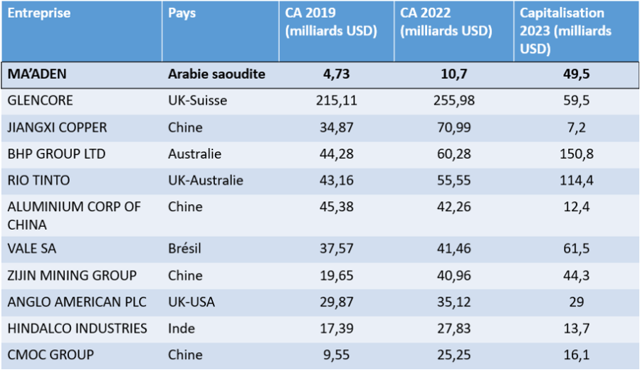 Tableau Ma’aden et les 10 plus grosses entreprises minières mondiales