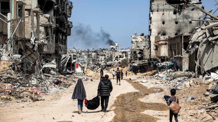 Des personnes marchent avec des objets récupérés devant des bâtiments détruits à Khan Yunis, dans le sud de la bande de Gaza, le 22 avril 2024, dans le cadre du conflit en cours dans le territoire palestinien entre Israël et le groupe militant Hamas. Israël a retiré ses forces terrestres de Khan Yunis le 7 avril après avoir mené ce qu’il a appelé une «opération précise et limitée» dans le complexe médical Nasser, l’un des plus grands hôpitaux du territoire palestinien. – AFP.Publié le 22/04/2024