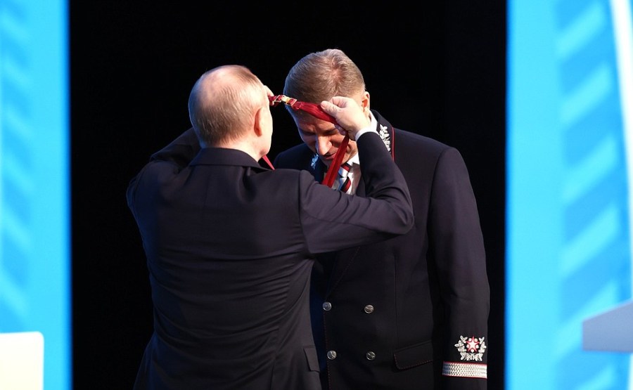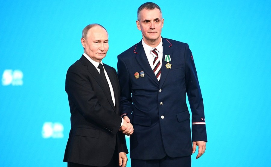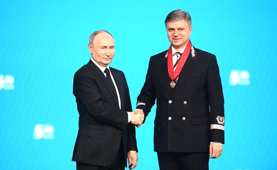 12Lors du gala célébrant les 50 ans du début de la construction du chemin de fer Baïkal-Amour. L’Ordre pour les services rendus à la Patrie, IIe degré, est décerné au PDG et président du conseil d’administration des chemins de fer russes, Oleg Belozerov. Photo : Vladimir Astapkovitch, RIA Novosti
