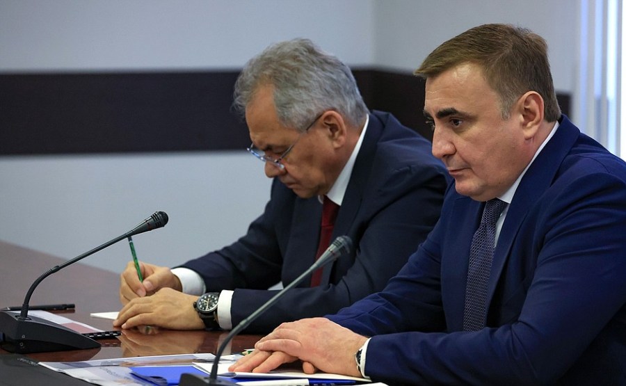 6 Le secrétaire du Conseil de sécurité, Sergueï Choïgu, à gauche, et l’assistant présidentiel Alexei Dyumin lors de la réunion avec les PDG des entreprises de l’industrie de défense.