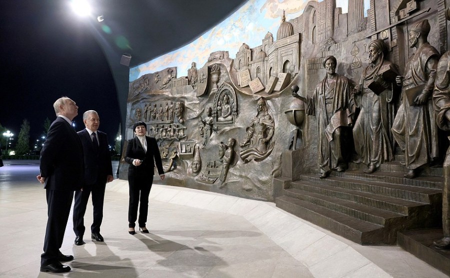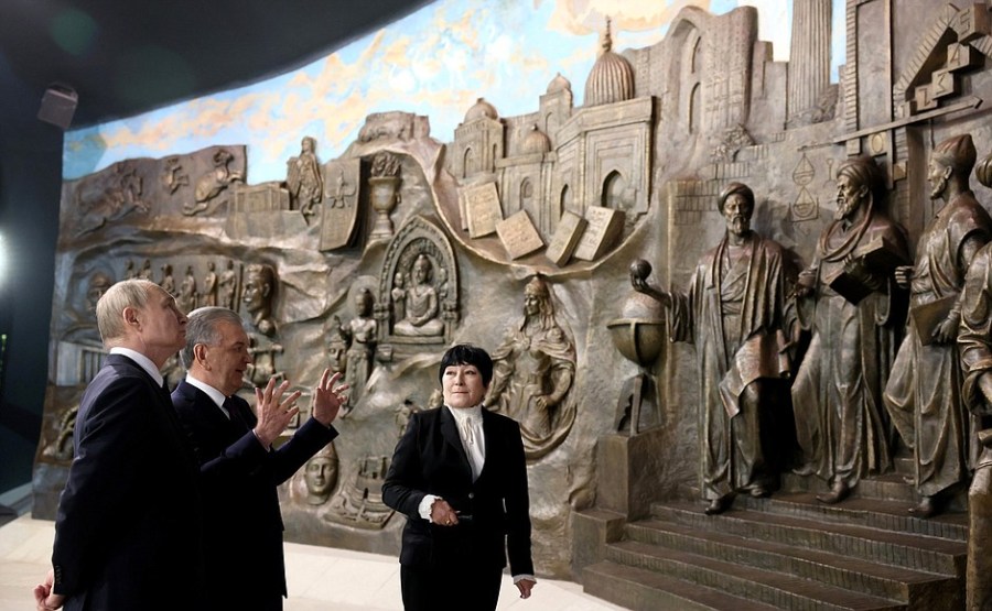6 Vladimir Poutine et Shavkat Mirziyoyev ont examiné un mur en bas-relief illustrant l’histoire de l’Ouzbékistan.