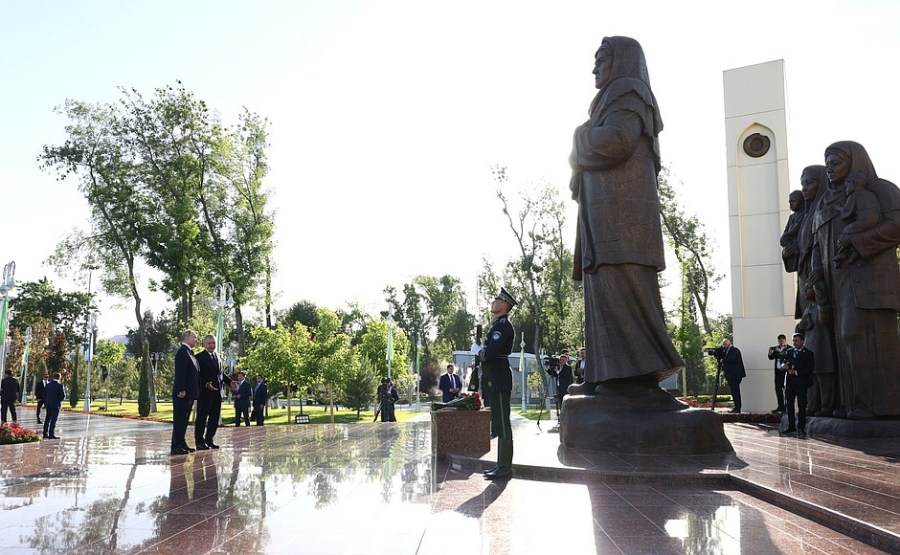 Les deux dirigeants ont déposé des fleurs au mémorial de l’Ode au courage consacré à la femme ouzbèke Zulfia Zakirova, qui vivait dans le village de Khanabad, district de Zangiota, région de Tachkent, et qui a perdu cinq fils au front pendant la Grande Guerre patriotique. Le mémorial représente toutes les femmes que la guerre a privées d’enfants, de maris et de proches.