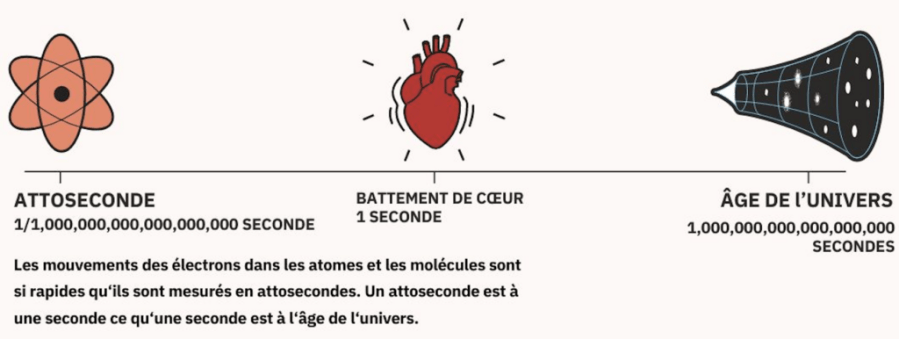En 2023, le Prix Nobel de physique récompense le développement de méthodes expérimentales permettant de générer des impulsions lasers attosecondes (10-18 secondes), des flashs d’une vitesse de l’ordre d’un milliardième de milliardième de seconde. Ils sont utiles à l’étude de la dynamique des électrons dans la matière. Trois scientifiques sont récompensés : Pierre Agostini, Ferenc Krausz et Anne L’Huillier.