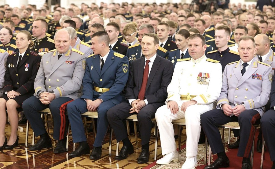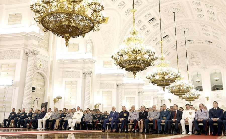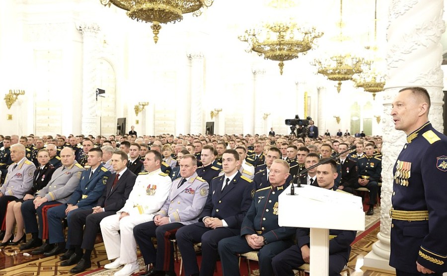 Dans la salle Saint-Georges du Grand Palais du Kremlin, Vladimir Poutine a rencontré les meilleurs diplômés des écoles militaires supérieures russes relevant du ministère de la Défense, du ministère des Situations d’urgence, du Service fédéral de sécurité, du Service fédéral de la Garde et de la Garde nationale, ainsi que des établissements d’enseignement supérieur relevant du ministère de l’Intérieur. , Commission d’enquête et Service pénitentiaire fédéral.