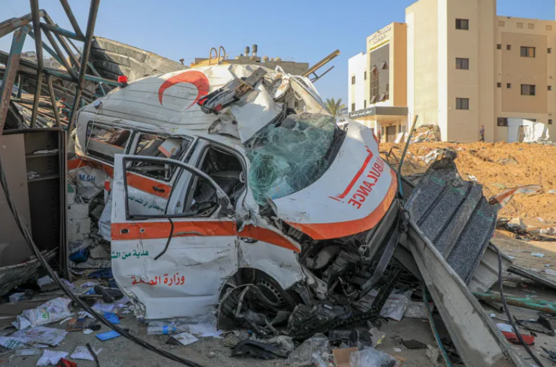 PHOTO 4Une ambulance détruite à l’hôpital Nasser de Khan Younis, dans le sud de la bande de Gaza, le 28 février 2024. Photo : Rizek Abdeljawad/Xinhua via Getty Images