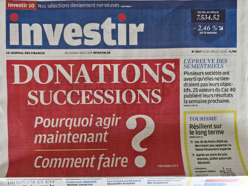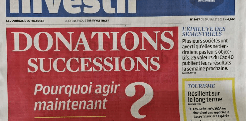 Et je ne suis pas le seul à en parler. Le Journal Investir a eu lui aussi le courage de le dire et même de l’imprimer en première page. Vous pouvez aller chez votre marchand de journaux l’acheter. Il y a deux pages concernant les donations et successions.