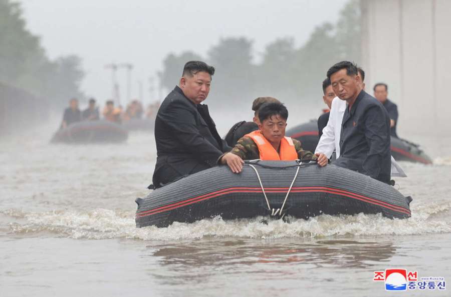 PHOTO Le dirigeant nord-coréen Kim Jong-un et le premier ministre Kim Tok Hun visitent une zone touchée par les inondations près de la frontière avec la Chine, dans la province de Pyongan du Nord, en Corée du Nord. KCNA / REUTERS (ON PARLE DE 1500 MORTS)