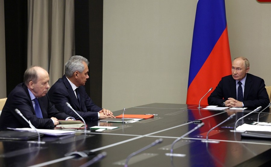 4 De droite à droite : le secrétaire du Conseil de sécurité Sergueï Choïgou, le ministre de la Défense Andreï Belousov et le directeur du Service fédéral de sécurité Alexandre Bortnikov lors de la réunion avec les membres permanents du Conseil de sécurité.