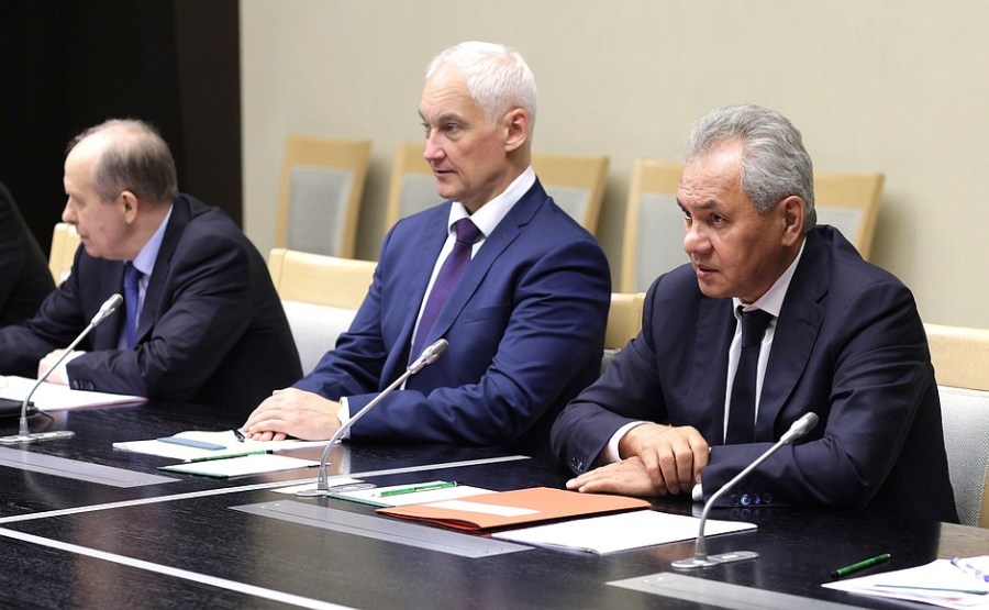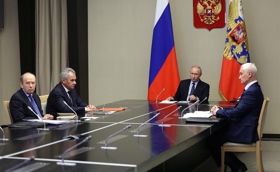 3 Avec le ministre de la Défense Andreï Beloussov (à droite), le secrétaire du Conseil de sécurité Sergueï Choïgou et le directeur du Service fédéral de sécurité Alexandre Bortnikov lors d’une réunion avec les chefs des forces de l’ordre.